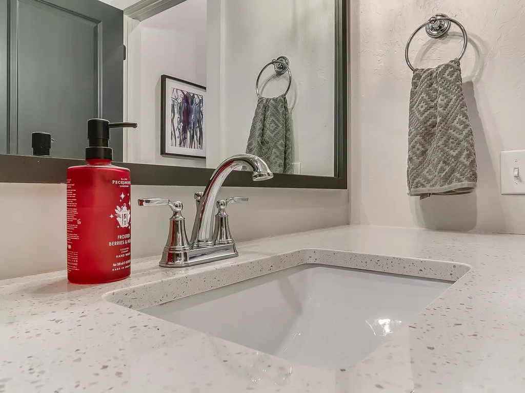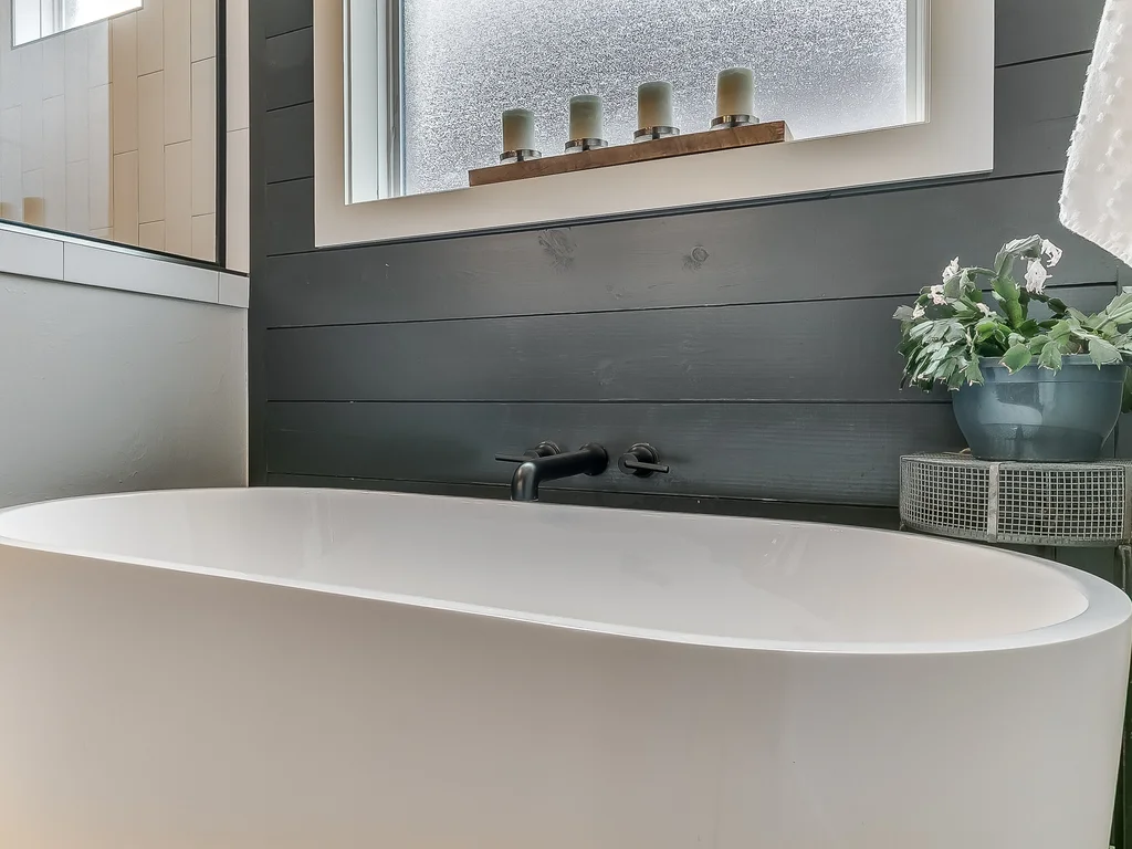The primary suite offers a relaxing retreat with stained wood cabinetry flanking the vanity, generous drawer storage, a sleek soaking tub, and a large oversized shower. Guests will appreciate the private ensuite bedroom, finished with classic white subway tile extending to the ceiling.