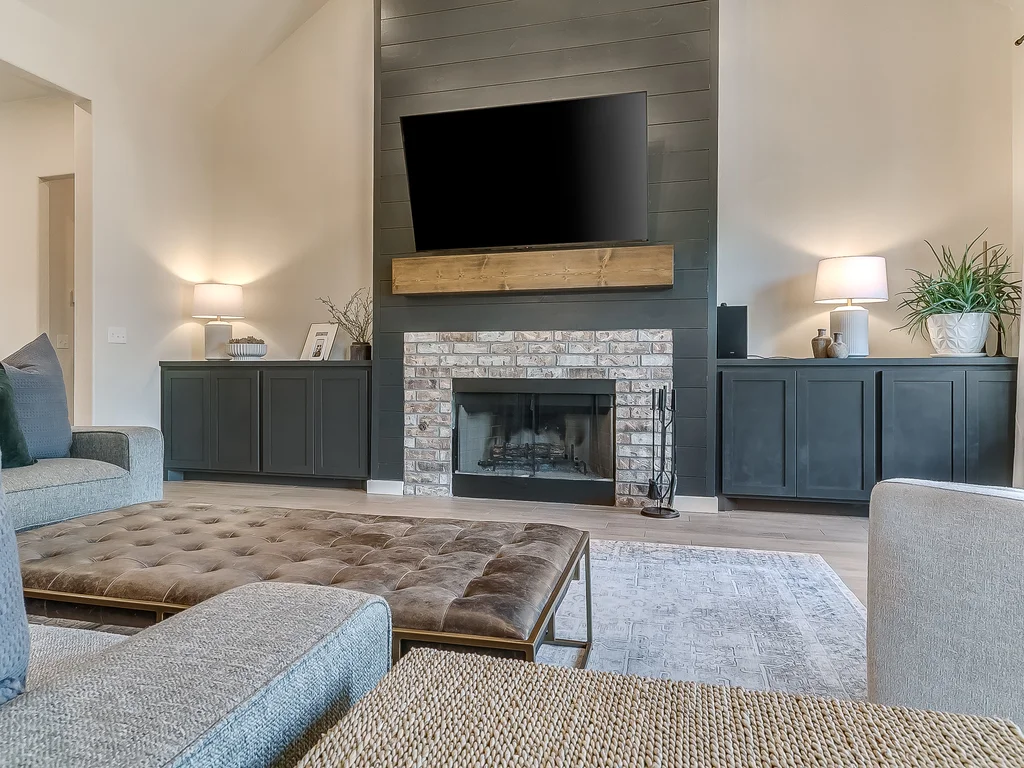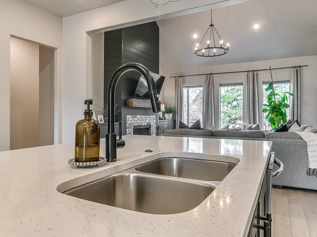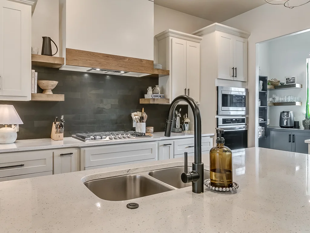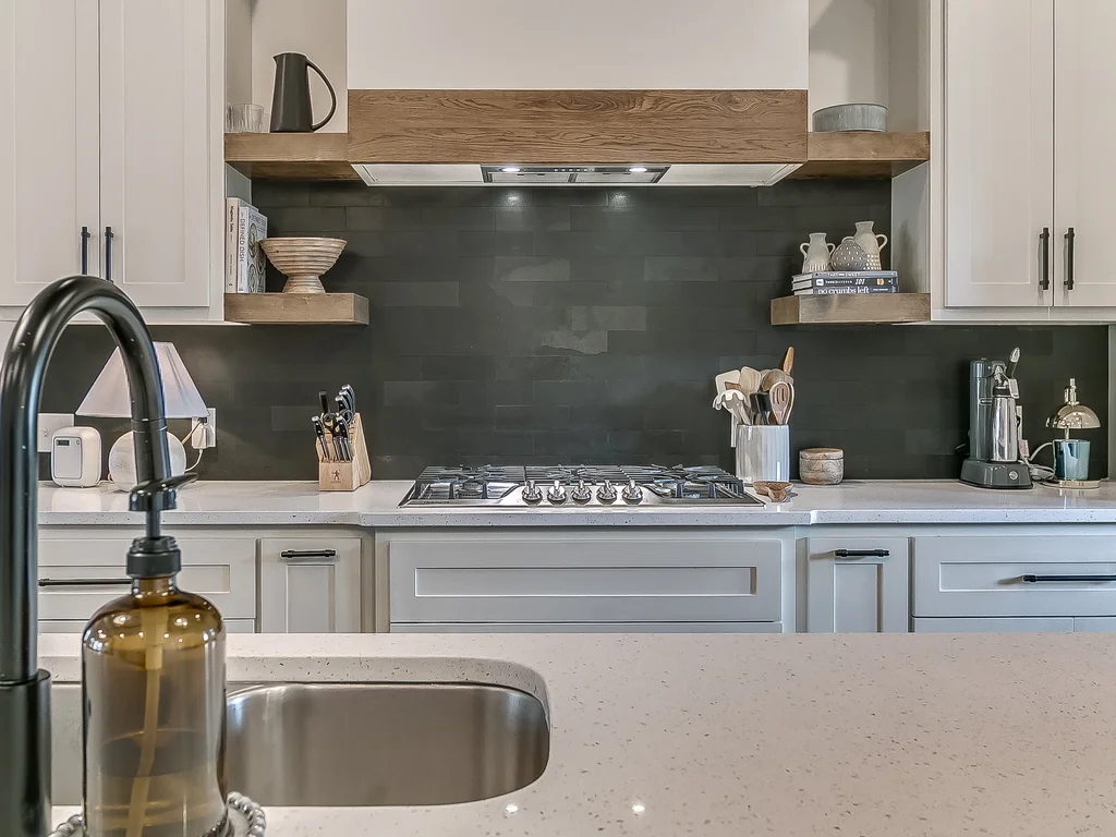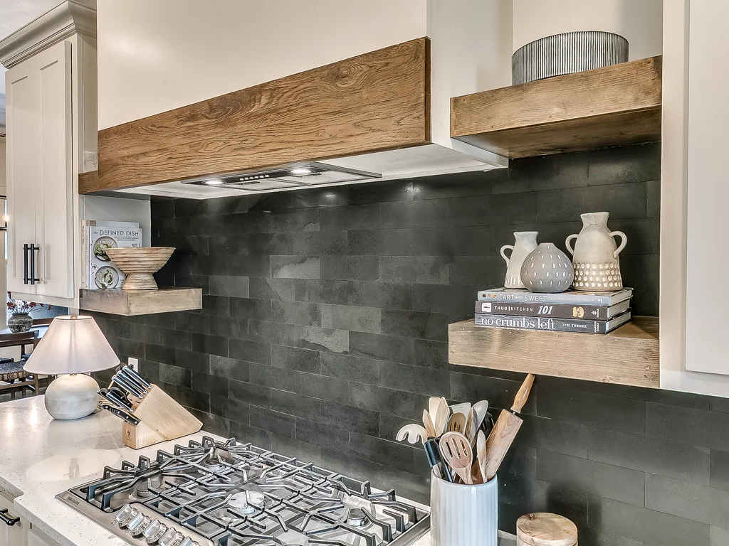 The kitchen is both stylish and practical, featuring a giant island with seating for four tucked just out of the main walkway, making it a natural gathering spot without interrupting the flow of the home. A matte black tile backsplash adds striking contrast and modern style, paired with stained wood accent shelves for warmth and character.