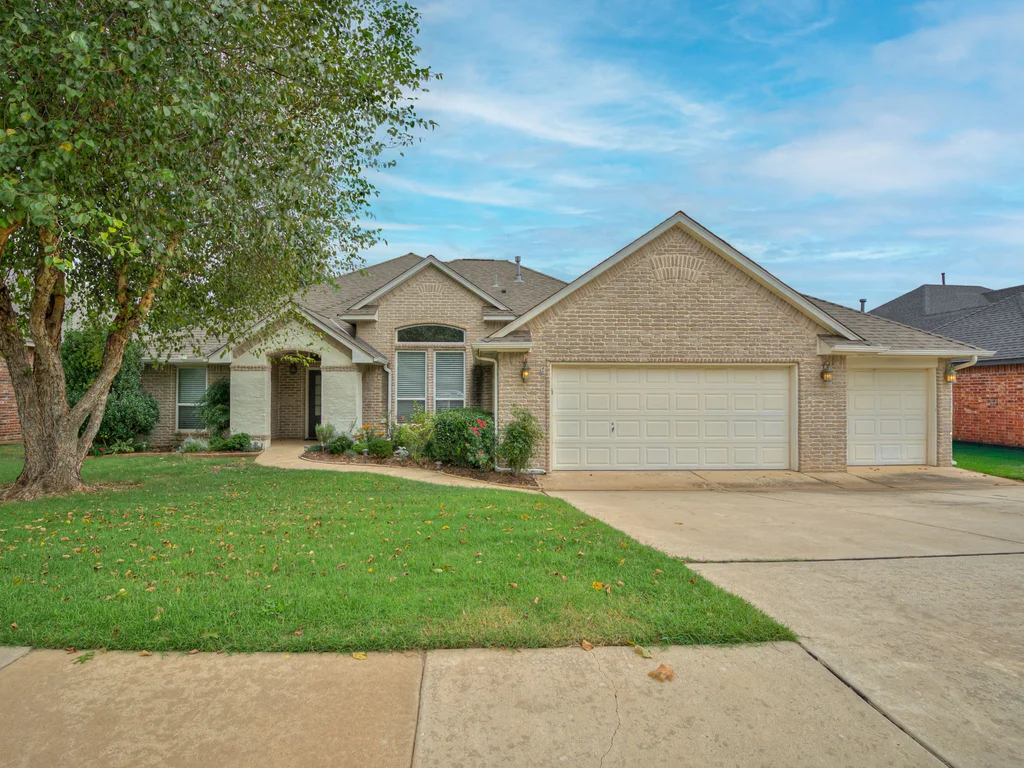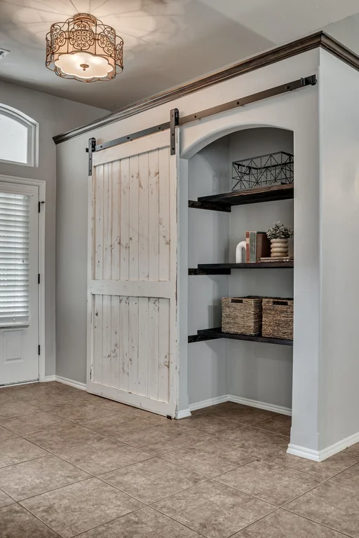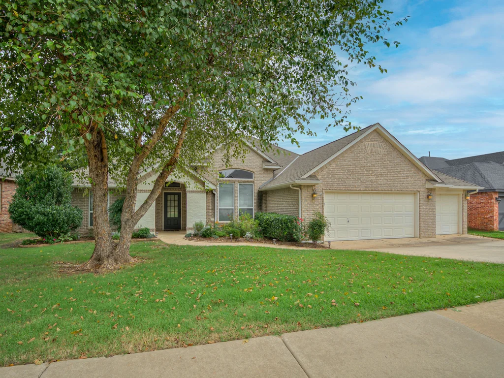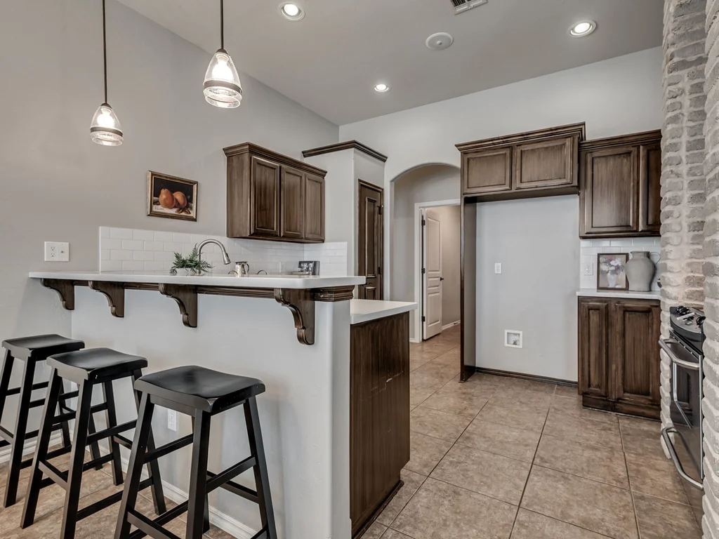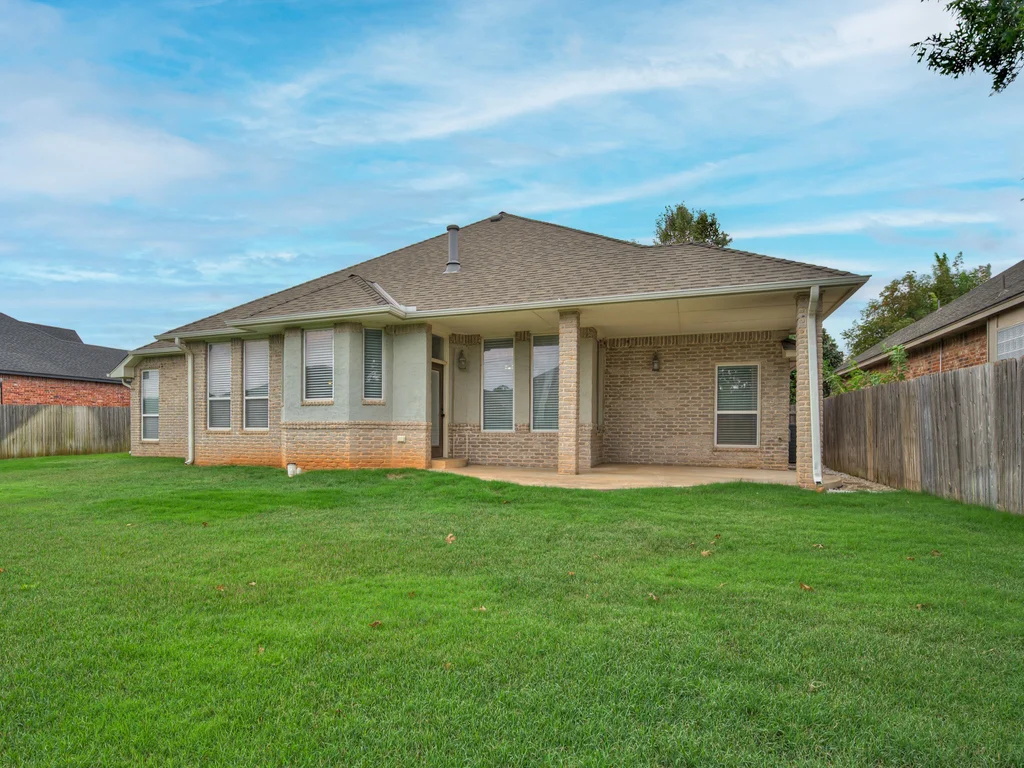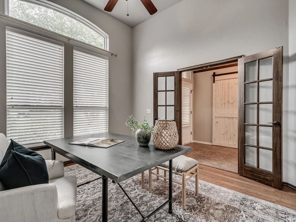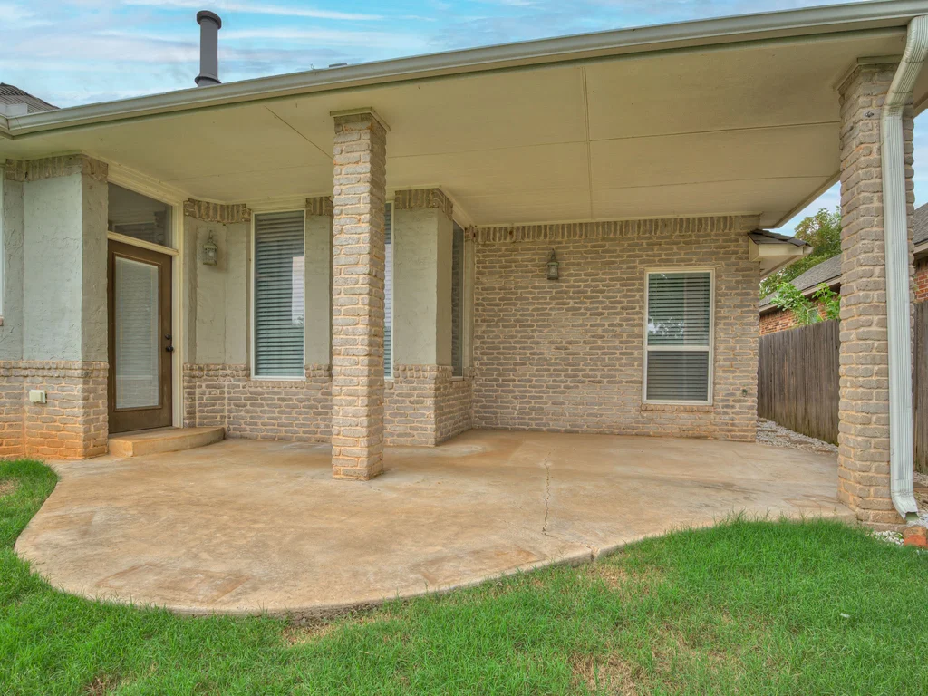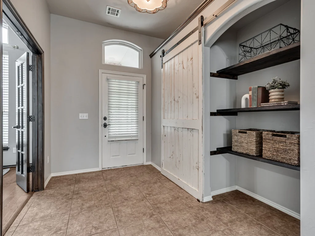 This 3-bedroom, 2.5-bath home in Edmond Schools offers a perfect balance of charm and convenience. The welcoming entryway features a cool arched barn door nook with shelves—ideal for storage or decor—and leads to a large study with soaring ceilings, perfect for work, play, or quiet retreat. The kitchen is a true centerpiece with quartz countertops, a gas stove, and a brick-arched area over the cooktop that adds timeless style.
