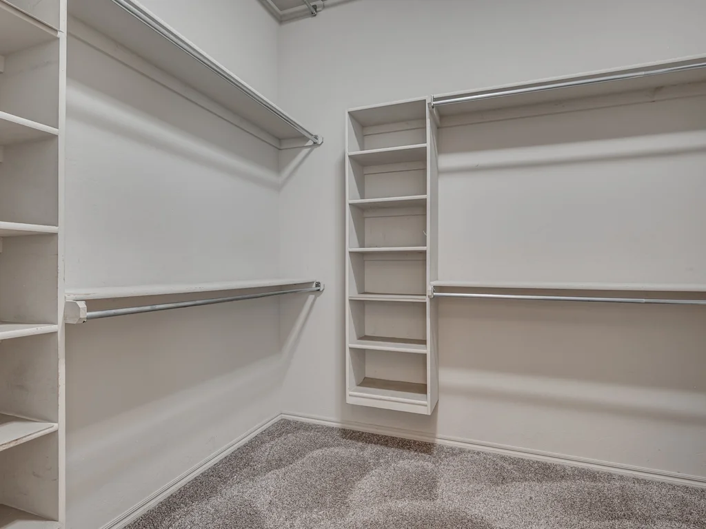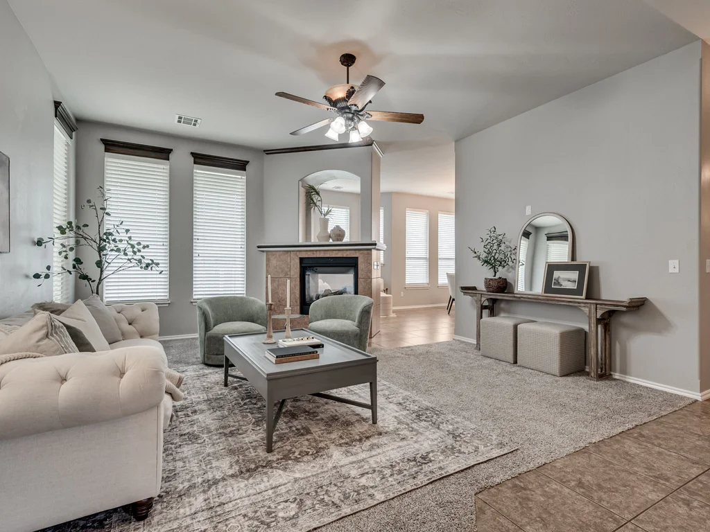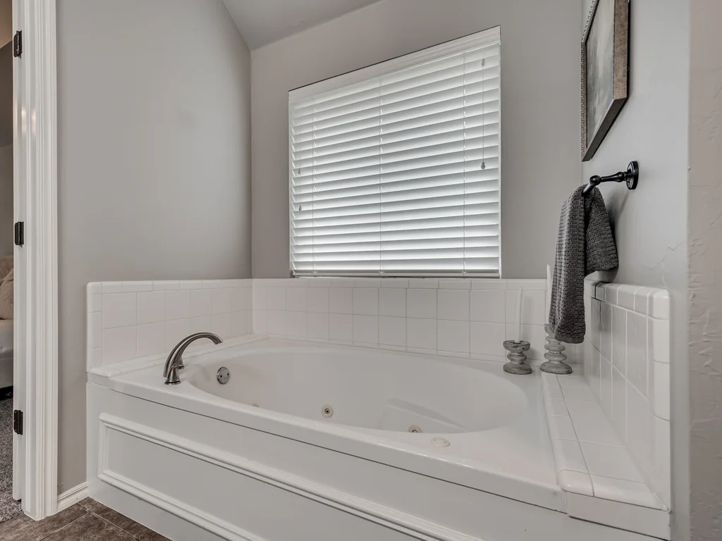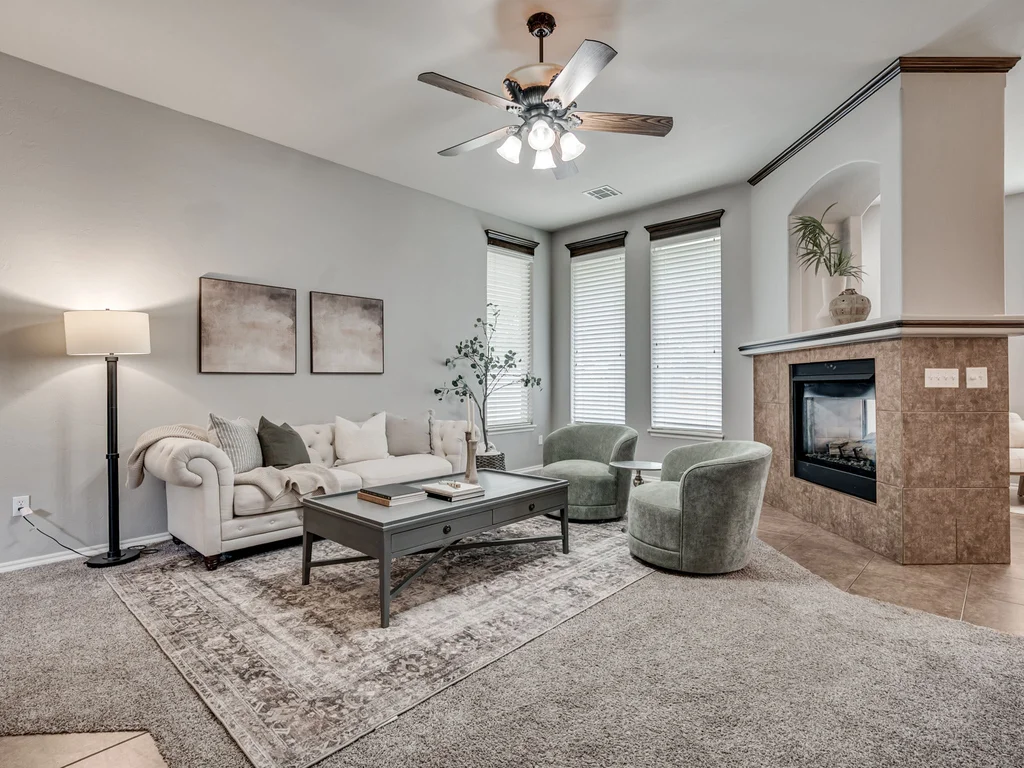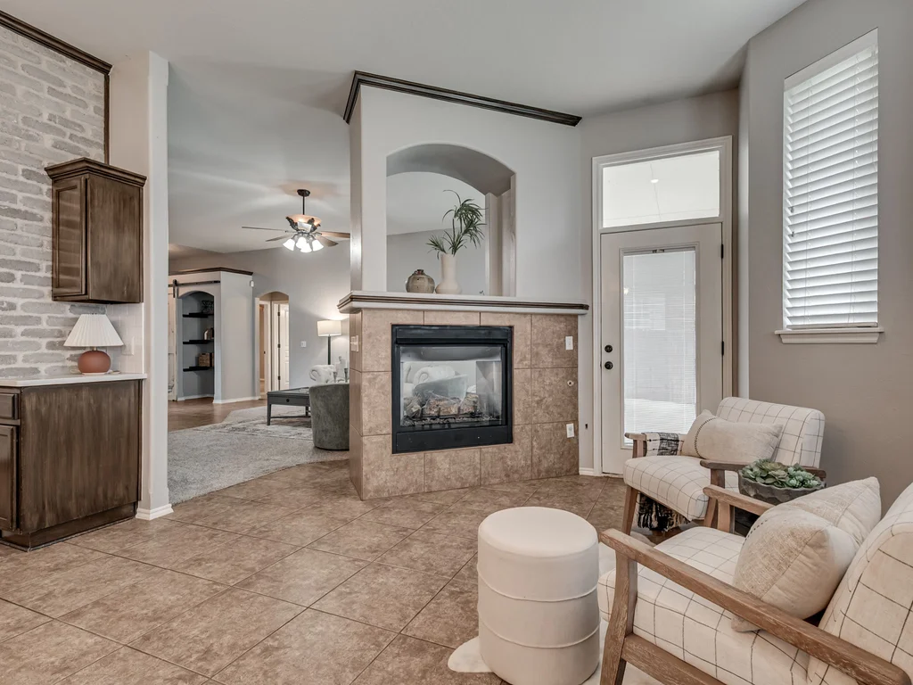 The living room shines with its unique fireplace framed by an open arched display area and flooded with natural light. The primary suite is a private retreat featuring a jetted tub, separate shower, double vanity, and a large walk-in closet for maximum storage.
