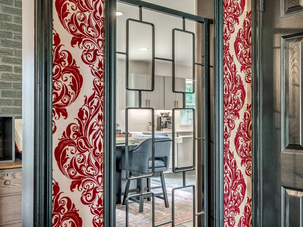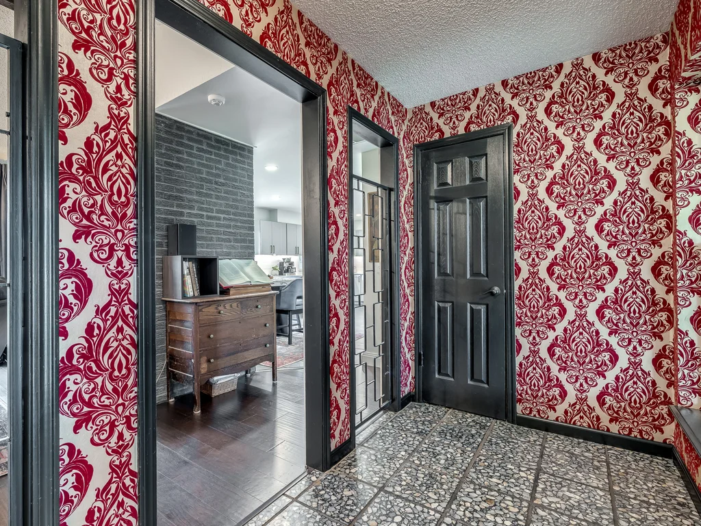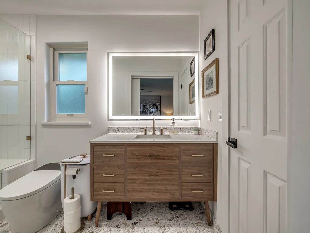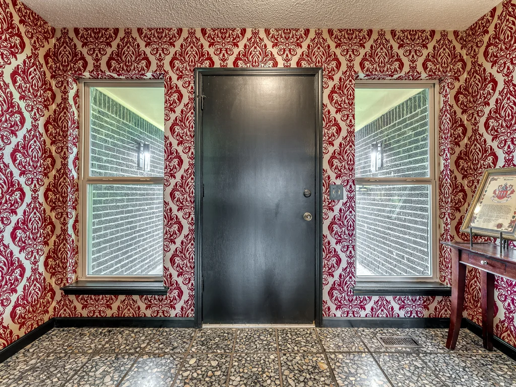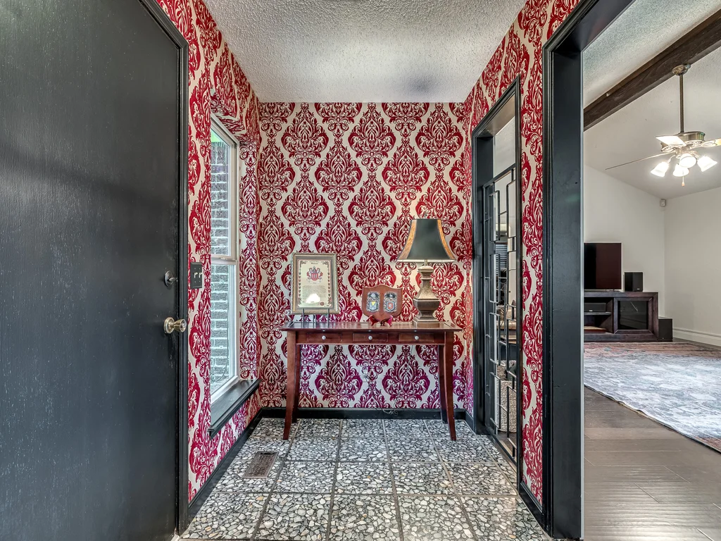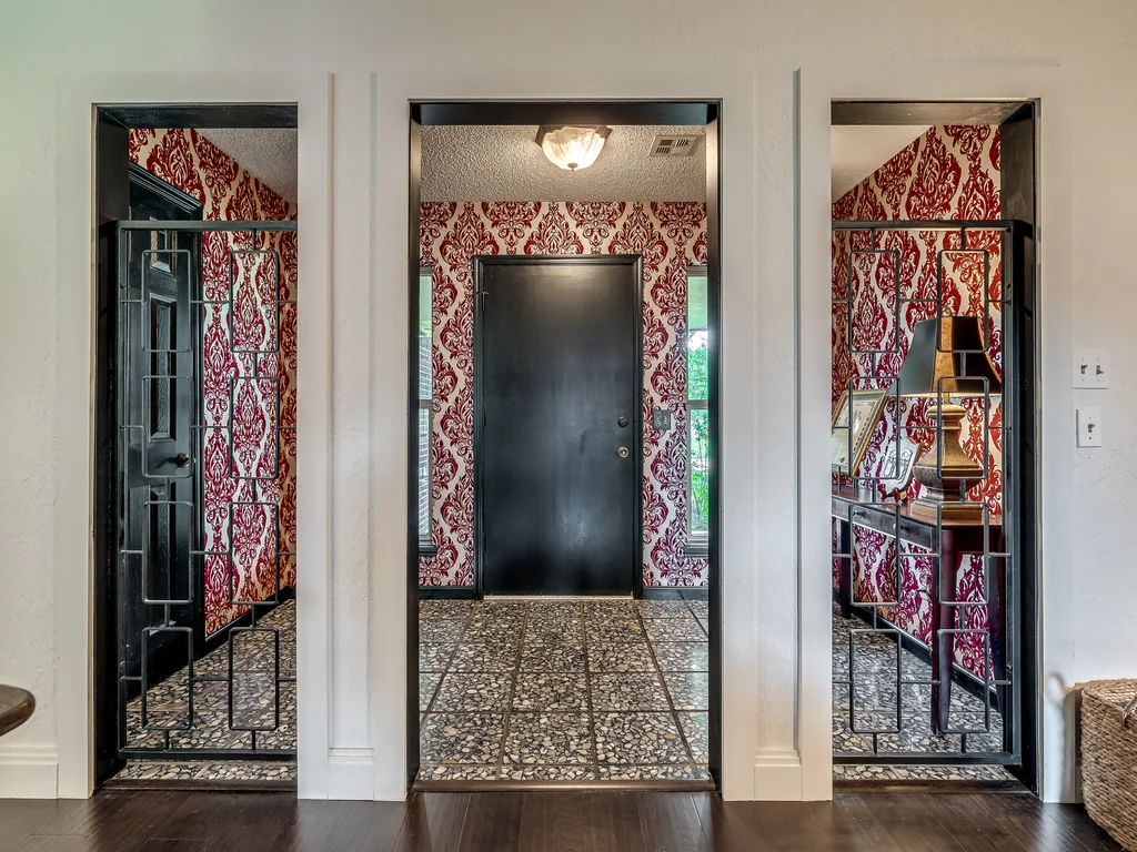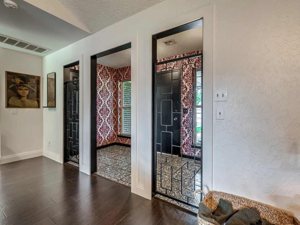 At the entryway, original terrazzo floors, flocked wallpaper, and a striking mid-century rectangular wrought iron detail set the tone for this home’s unique character. The primary suite is a private retreat with a completely remodeled bathroom featuring a spa-like shower with bench, sleek single vanity, Vissani bidet, and terrazzo floors that carry through with timeless style.