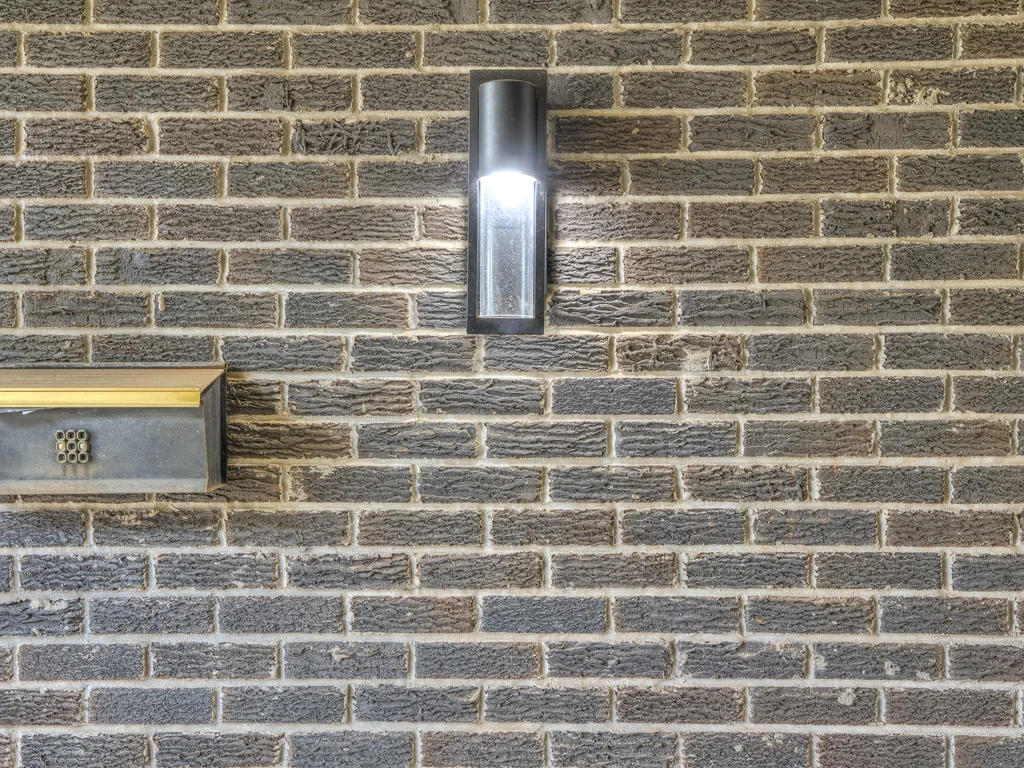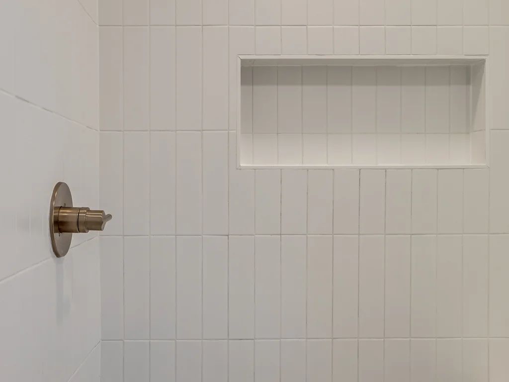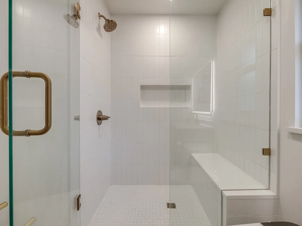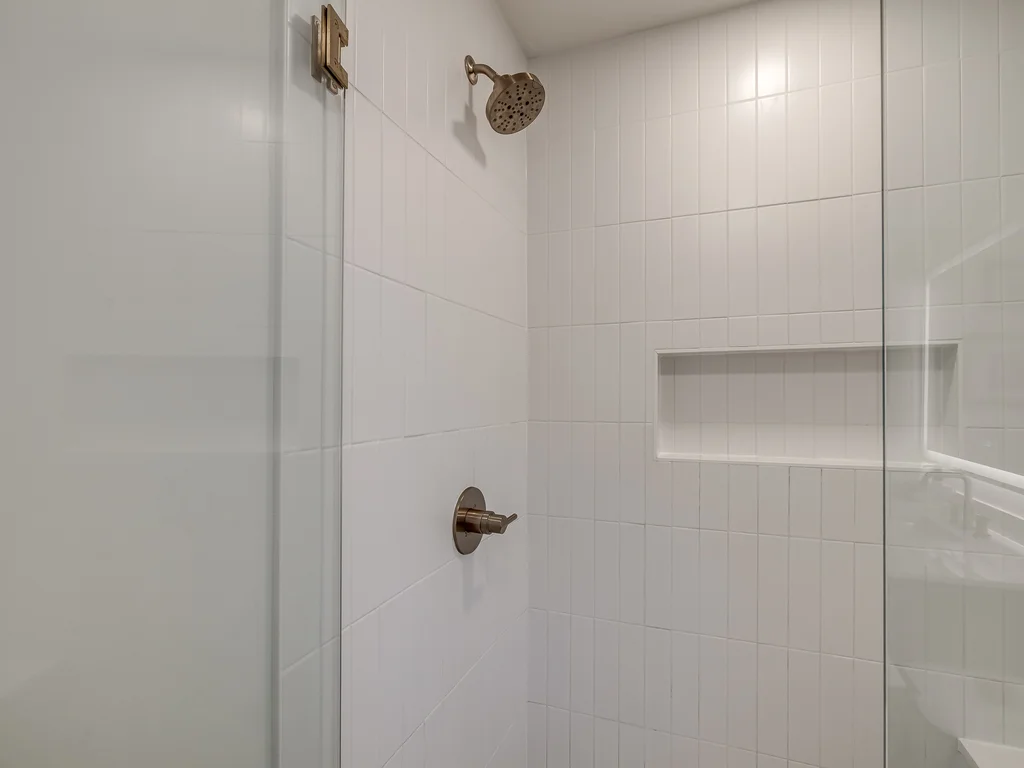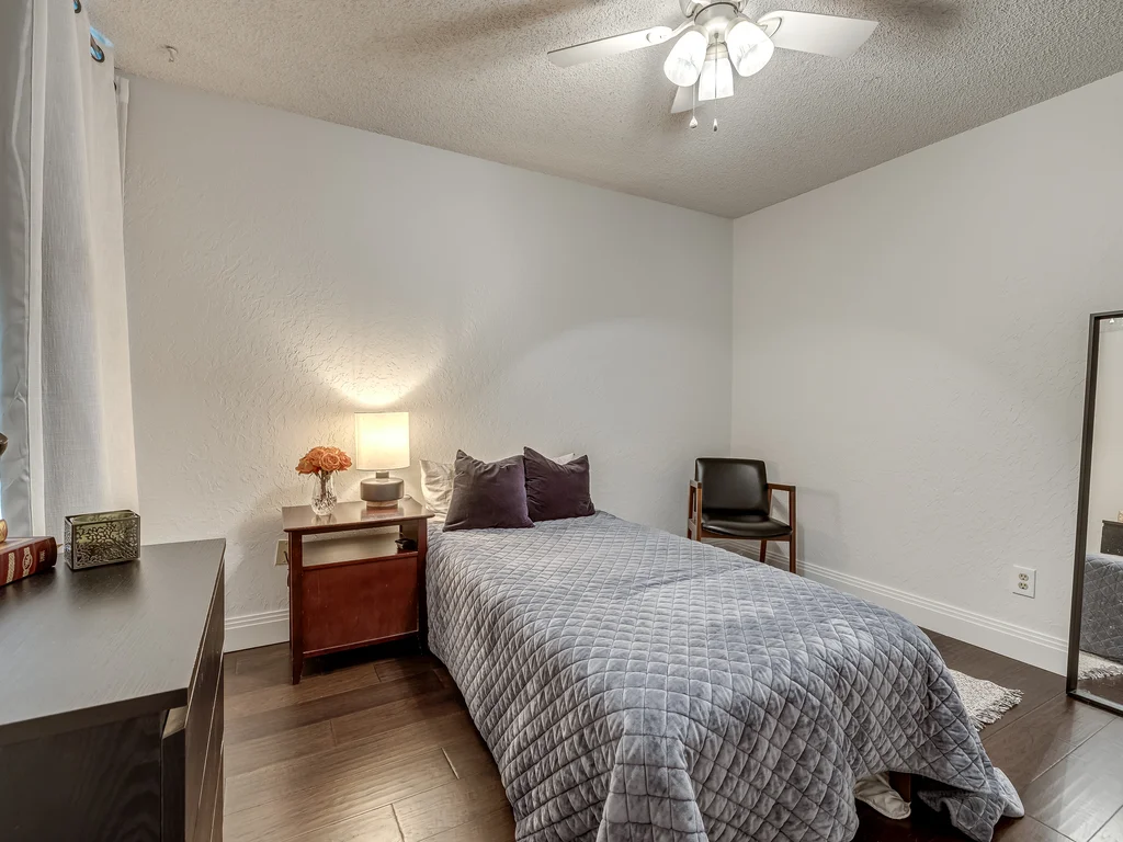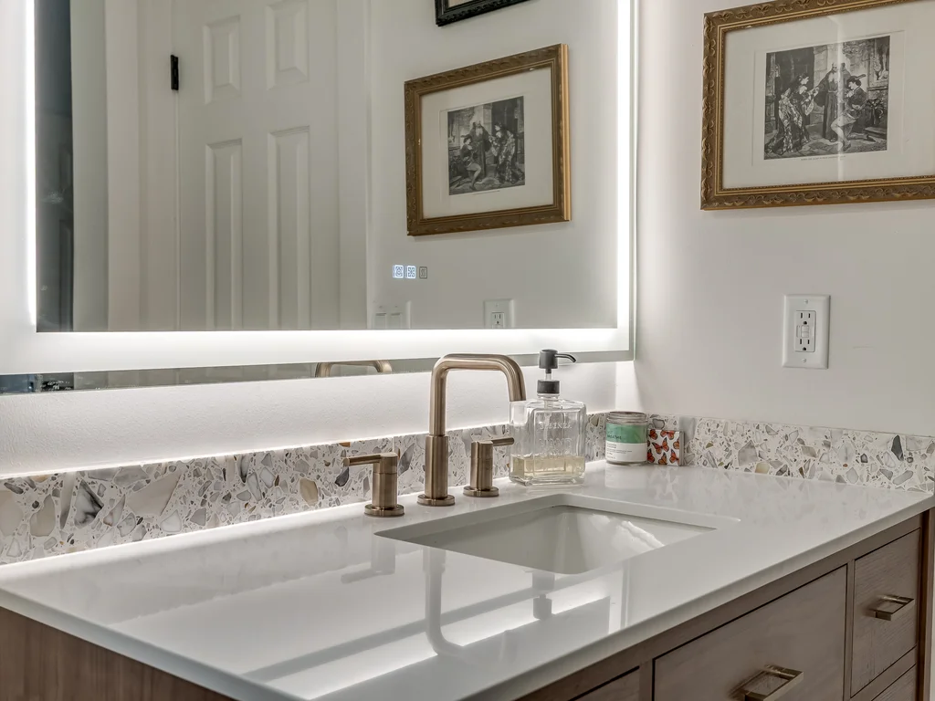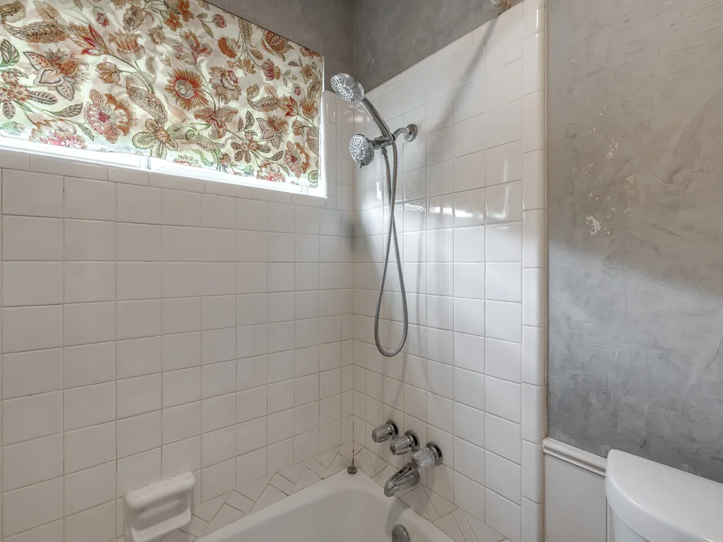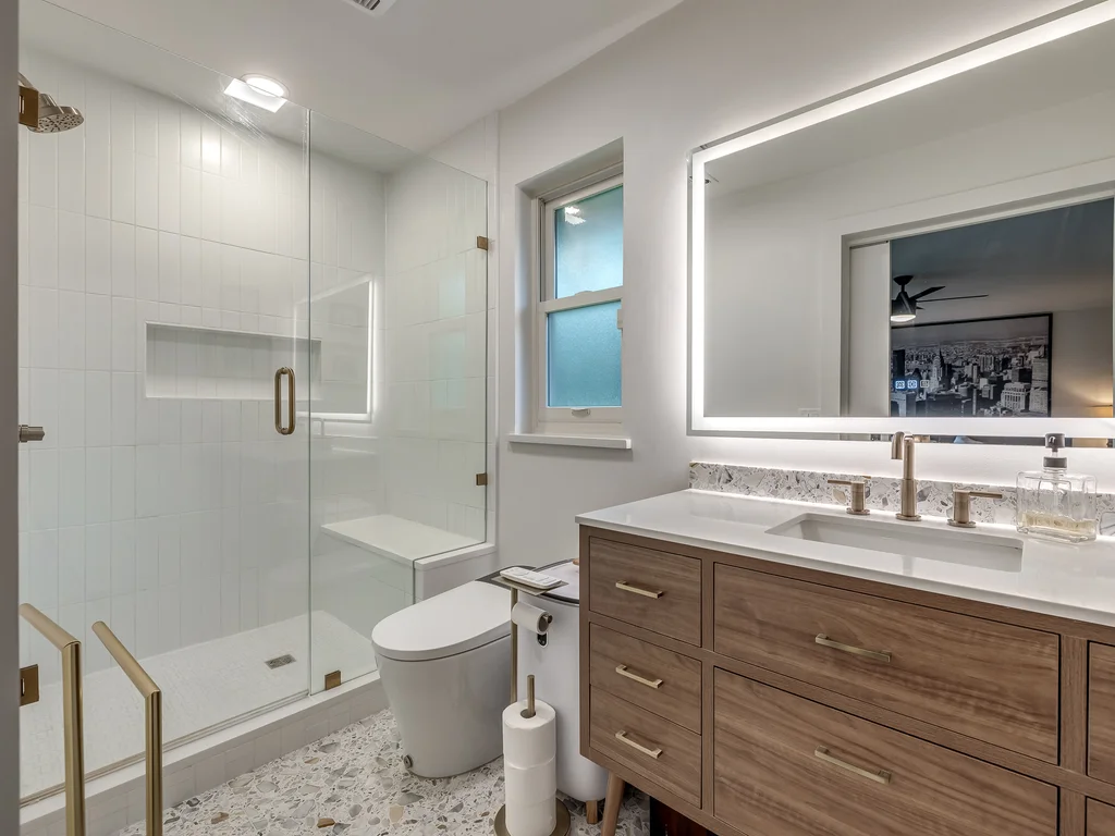 At the entryway, original terrazzo floors, flocked wallpaper, and a striking mid-century rectangular wrought iron detail set the tone for this home’s unique character. The primary suite is a private retreat with a completely remodeled bathroom featuring a spa-like shower with bench, sleek single vanity, Vissani bidet, and terrazzo floors that carry through with timeless style.