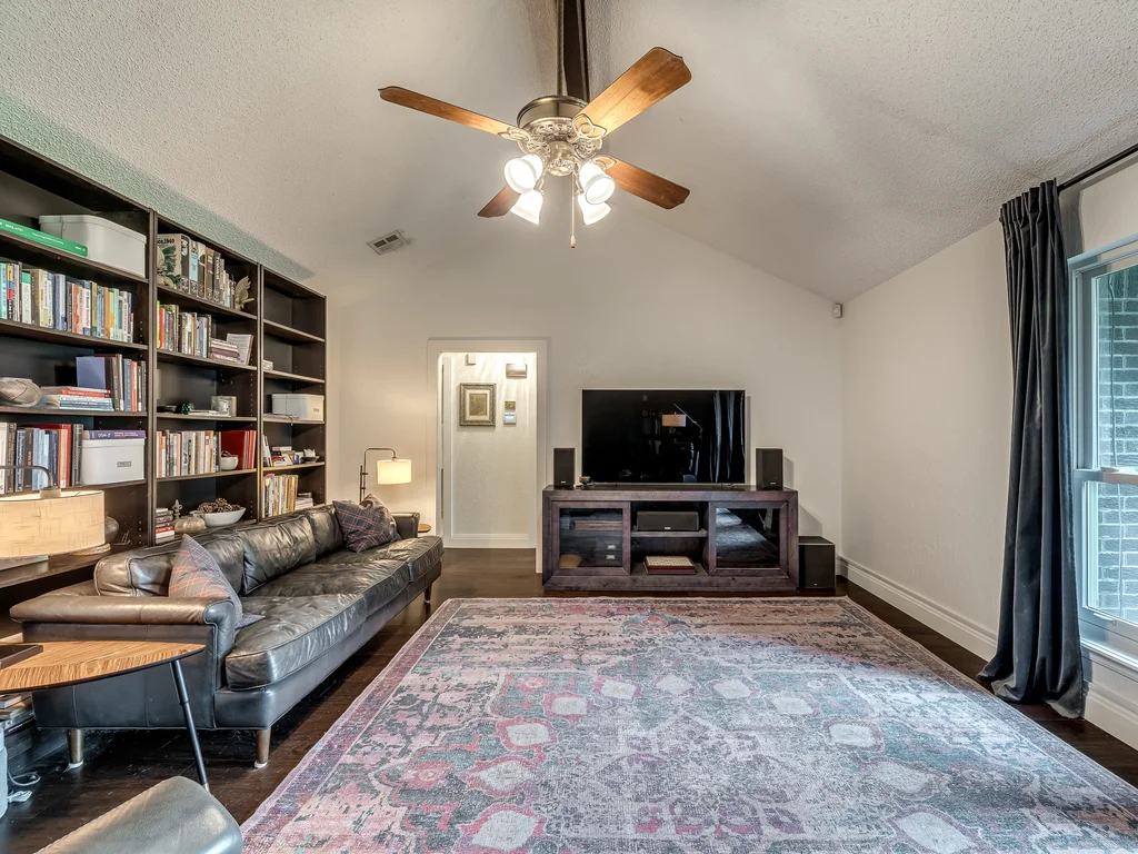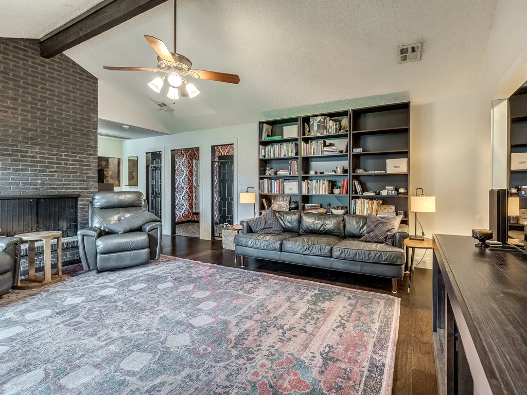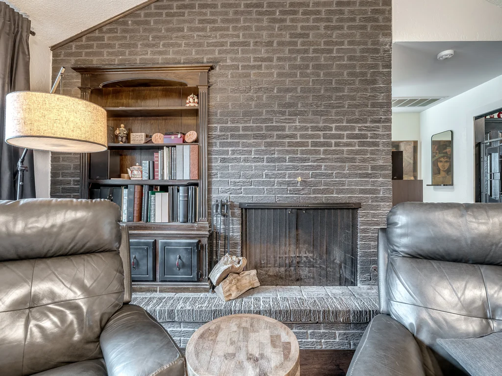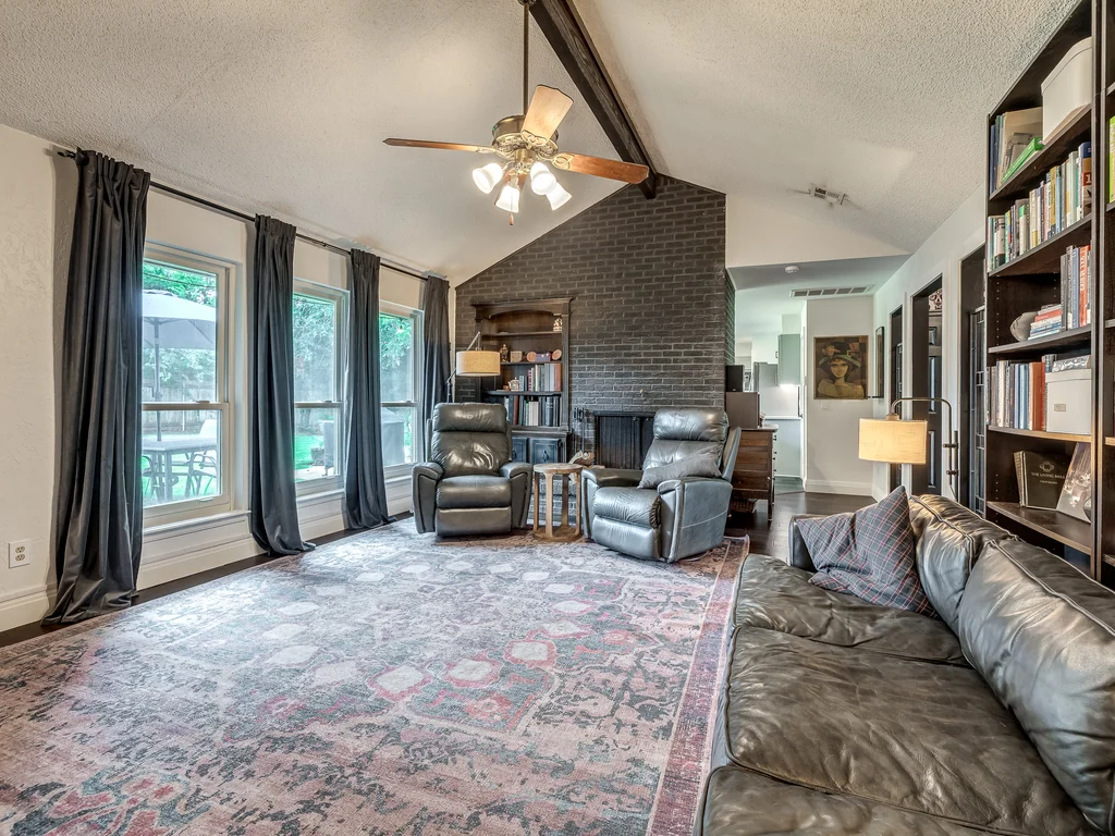 entertaining. The living room stuns with a cathedral ceiling, a cool brick fireplace, built-in bookcase, and three oversized