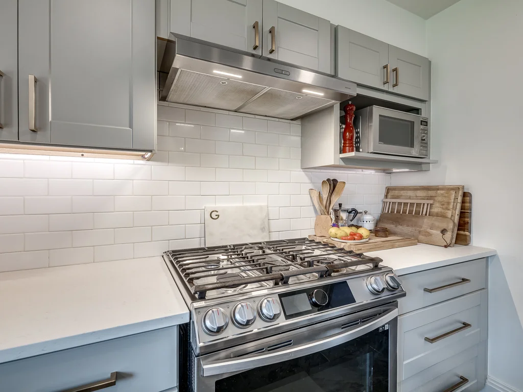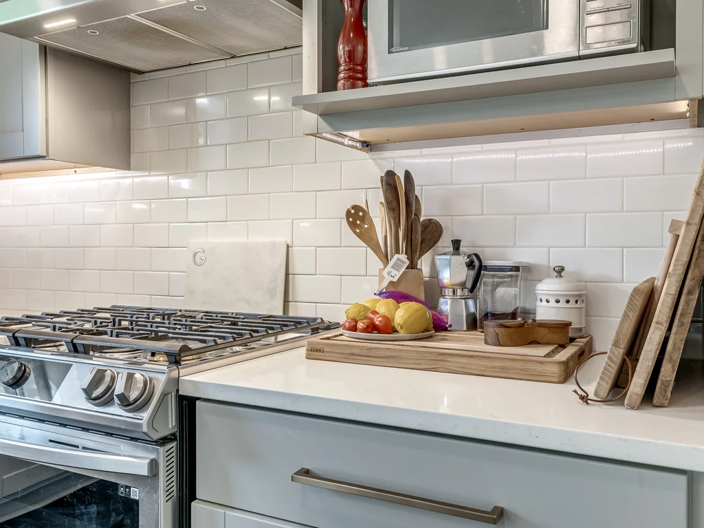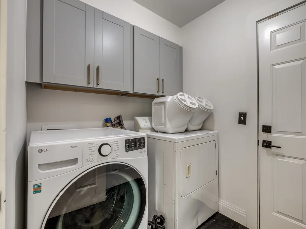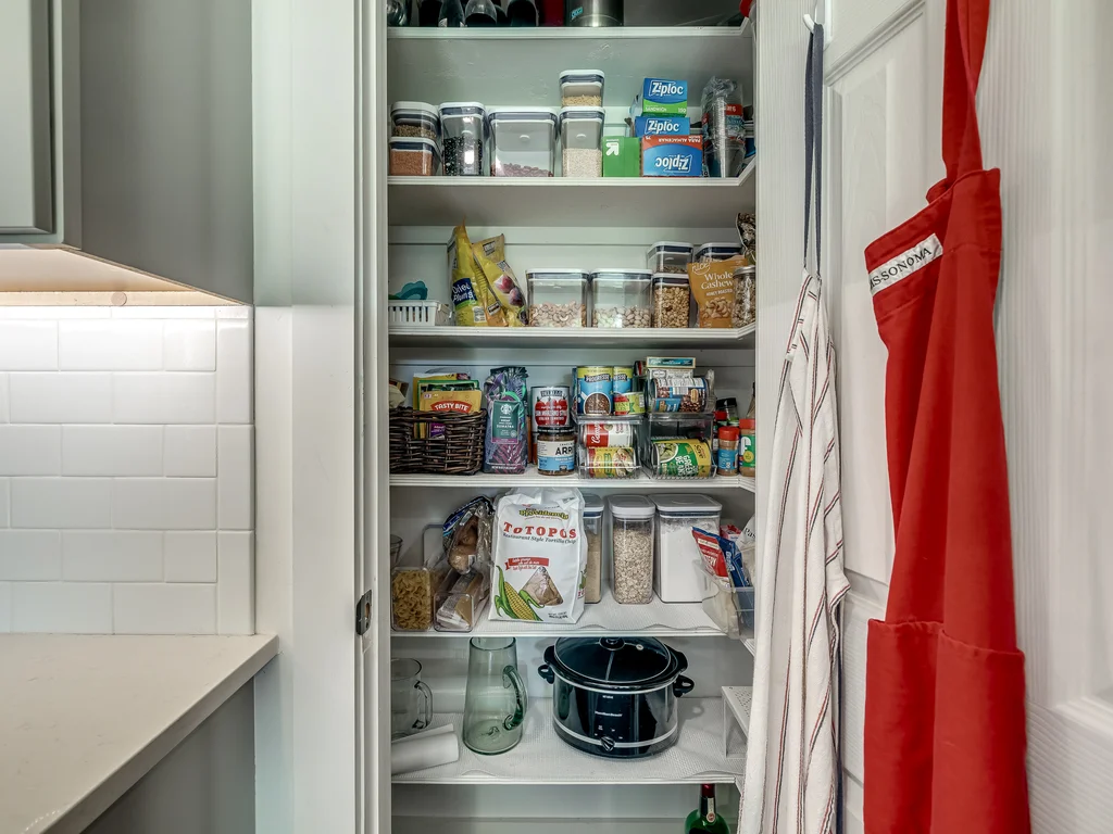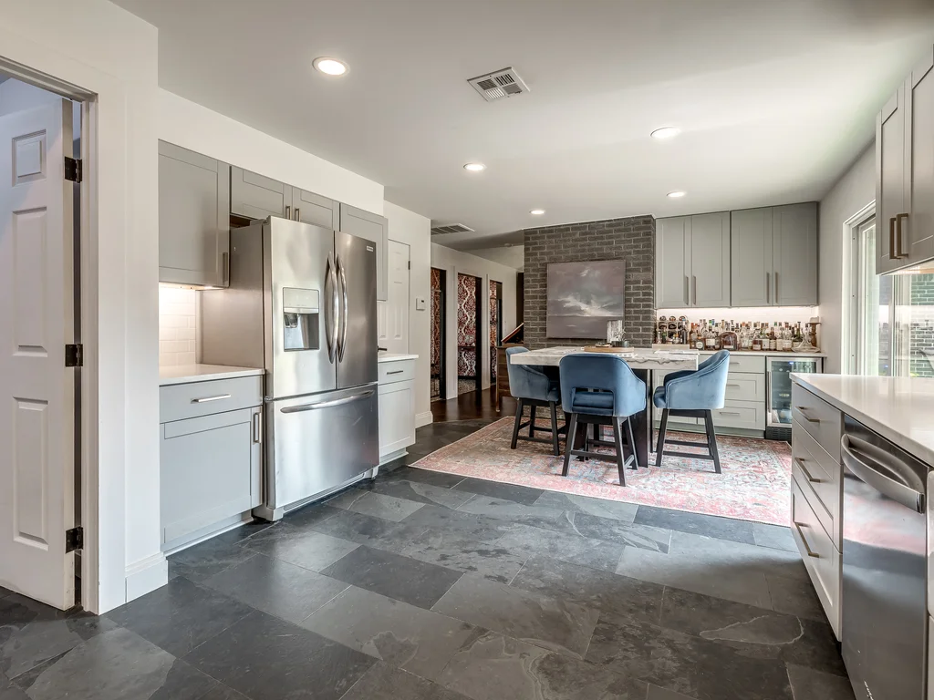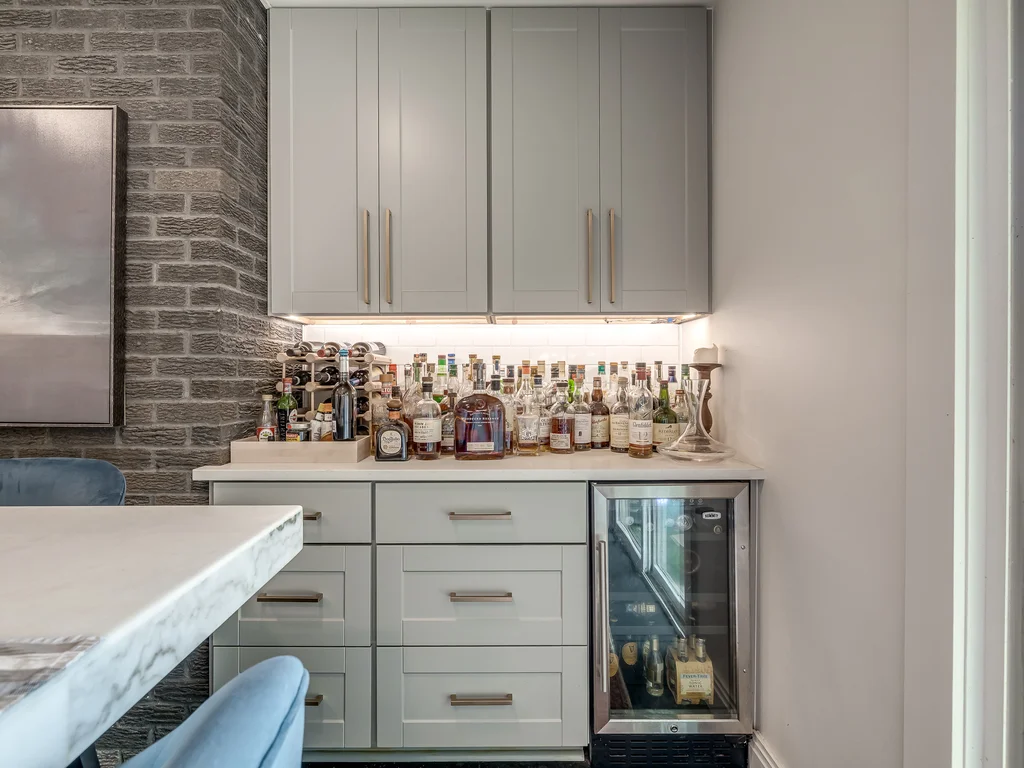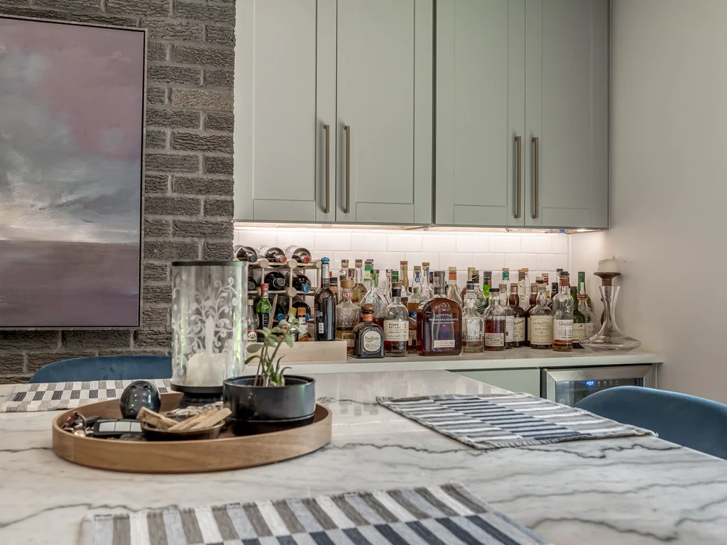 with gorgeous quartz counters, abundant cabinetry, a pantry, and a smooth vibes bar with wine fridge—perfect for