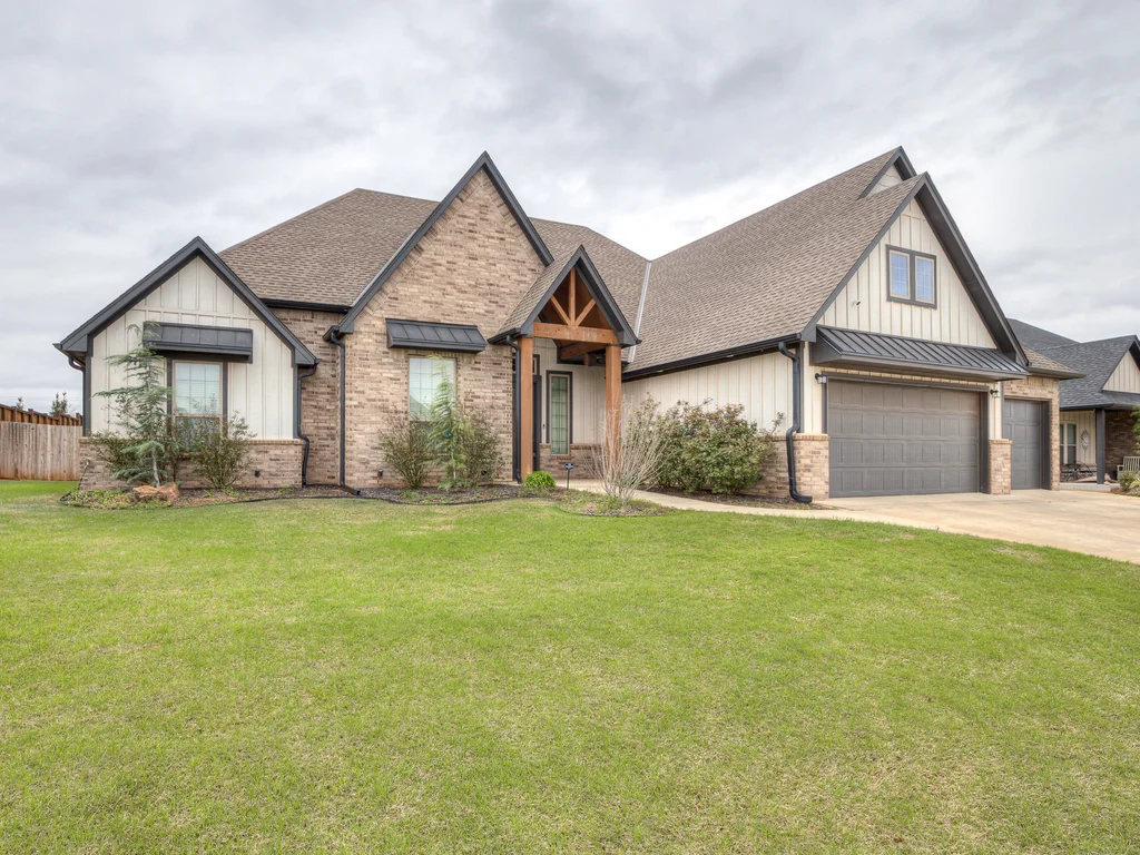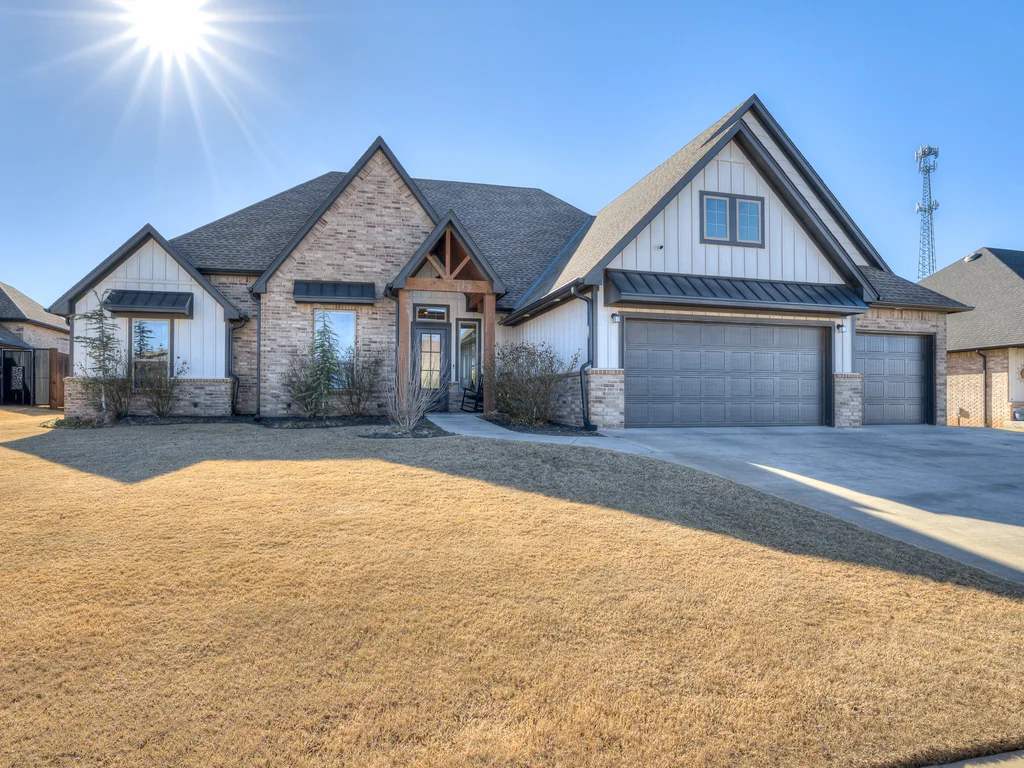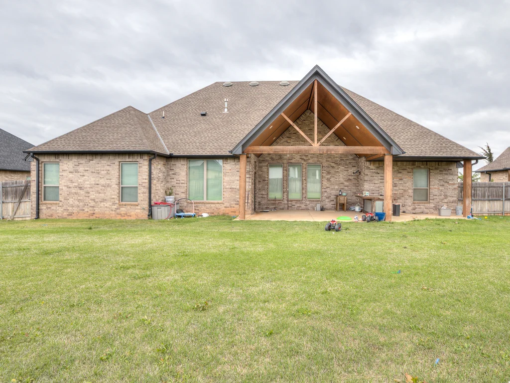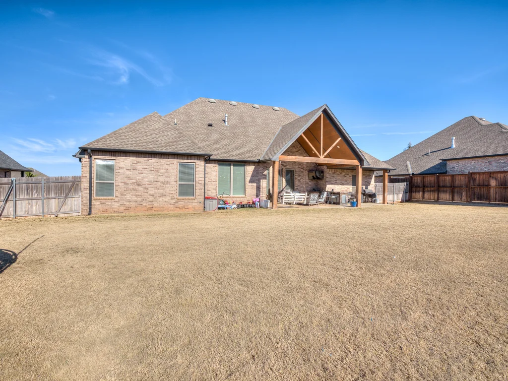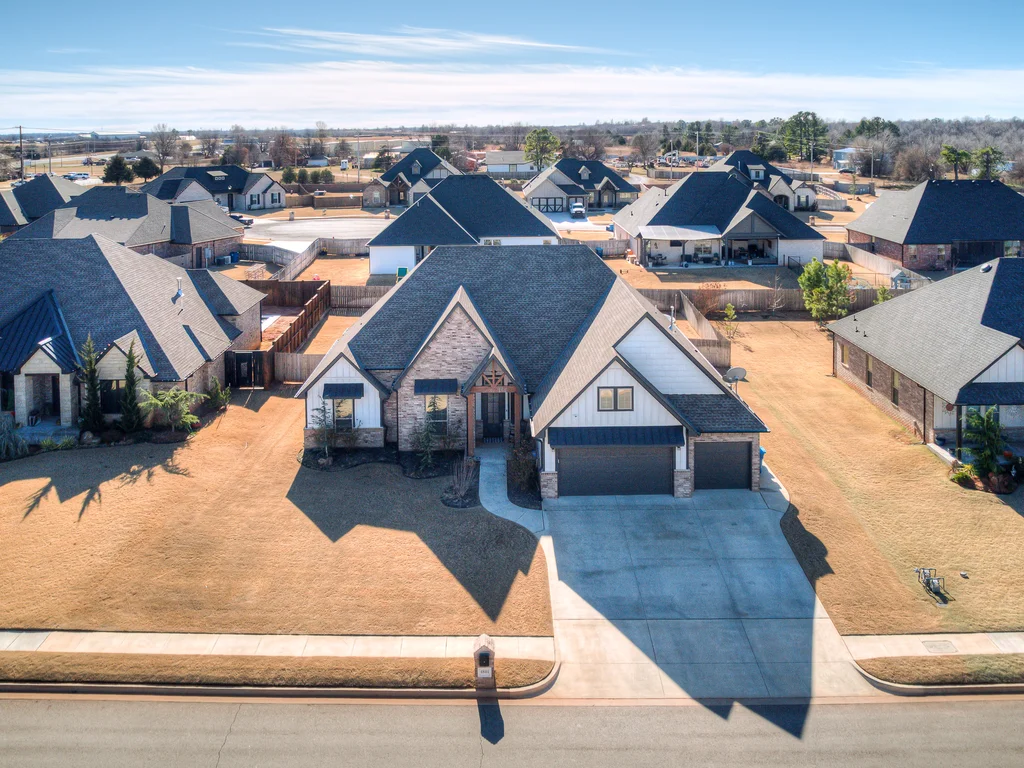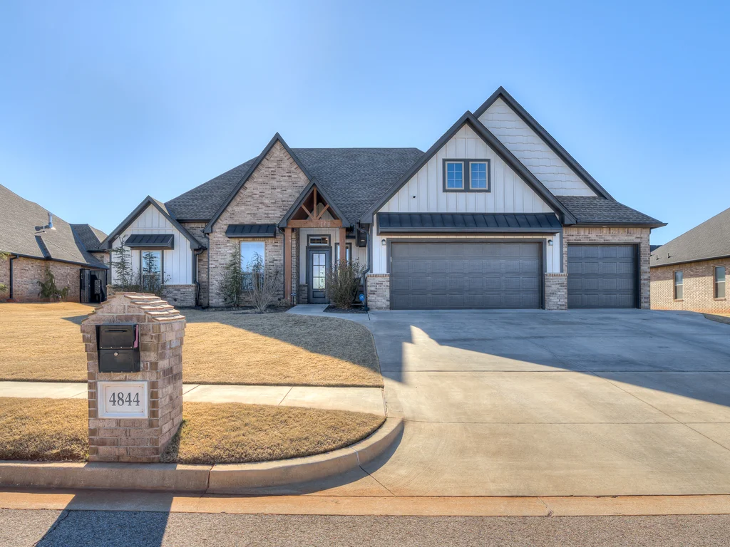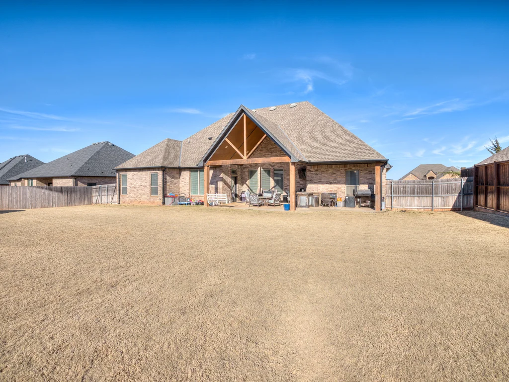 Beautifully situated in Montford of Tuttle, 4844 Constitution Lane will check all of your boxes, from curb appeal to the idyllic floor plan to the spacious backyard! 3 bedrooms + a dedicated study great for the work from home schedule! Study can also be used as an additional bedroom, playroom or whatever you choose. Perks & amenities: front & backyard sprinkler system, security alarm, security cameras, video doorbell, and an above ground storm shelter. The stunning engineered wood flooring, accompanied by high ceilings and natural light gives the main living areas a neutral and elegant feel! Let's talk about this kitchen- Zline brand SIX burner, dual convection oven for the chef in your life! Walk in pantry, floor to ceiling cabinetry with upper and lower LED lighting, large island with plenty of workspace and seating. Master ensuite offers dual sinks, soaker tub and a walk-in shower! The master closet showcases tons of space, built in shelving and conveniently attaches to the generously sized laundry room! Near the laundry you will find a powder bath and a mudroom great for dropping shoes, work bags and backpacks. Secondary bedrooms are located on the opposite side of the primary bedroom- with a jack and jill full bath. Floorplan and approximate* dimensions in the photos! Tv mounts, garage refrigerator and custom Christmas lights to stay with the home. Just 10 minutes away from the town of Mustang, shopping, restaurants, highway and turnpike!